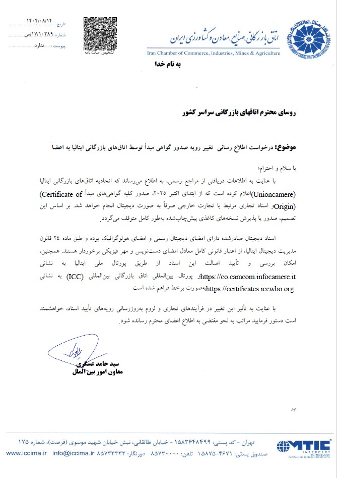اطلاع رسانی درباره تغییر رویه صدور گواهی مبدأ توسط اتاقهای بازرگانی ایتالیا به اعضا