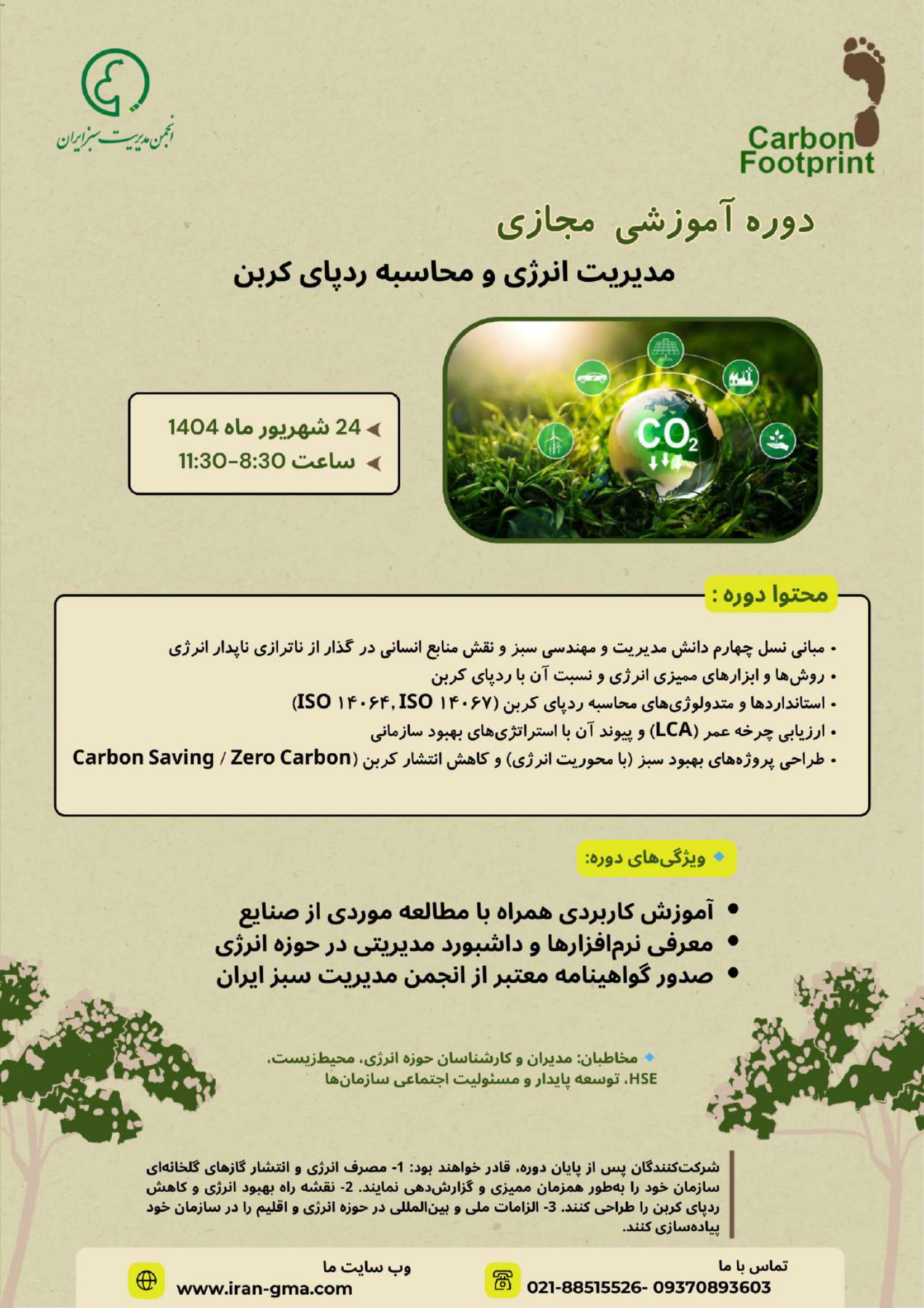 ۱- دوره مجازی مدیریت انرژی و محاسبه ردپای کربن (۲۴ شهریورماه ۱۴۰۴)