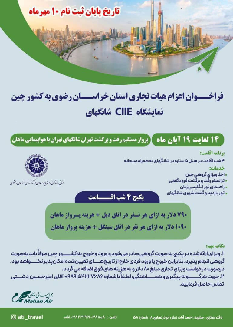 نظر به درخواست اعضا و فعالان اقتصادی استان، اتاق بازرگانی، صنایع، معادن و کشاورزی خراسان رضوی در نظر دارد به منظور بازدید از «نمایشگاه بین المللی واردات چین» که از تاریخ ۱۴ لغایت ۱۹ آبان ماه سال جاری ( برابر با ۵ لغایت ۱۰ نوامبر ۲۰۲۵) در شهر شانگهای برگزار میگردد، یک هیأت تجاری - اقتصادی متشکل از فعالان اقتصادی و اعضای محترم اتاق را اعزام نماید.