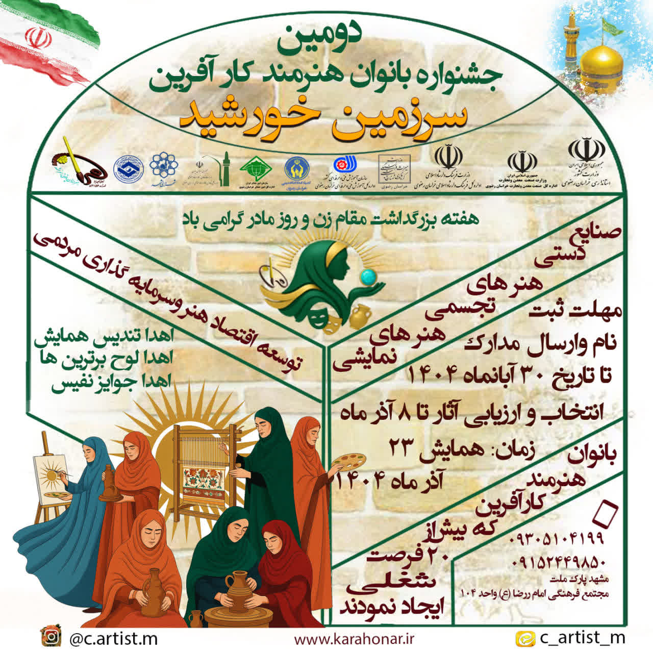 به استحضار میرساند دومین جشنواره بانوان هنرمند کارآفرین « بانوان سرزمین خورشید » به مناسبت هفته بزرگداشت مقام زن و روز مادر، توسط تعاونی تأمین نیاز هنرمندان مشهد و با همکاری دستگاههای اجرایی استان برگزار میگردد . این جشنواره با هدف شناسایی و معرفی توانمندی های بانوان کارآفرین و هنرمند در حوزه های صنایع دستی، هنرهای تجسمی و هنرهای نمایشی برنامه ریزی شده است .