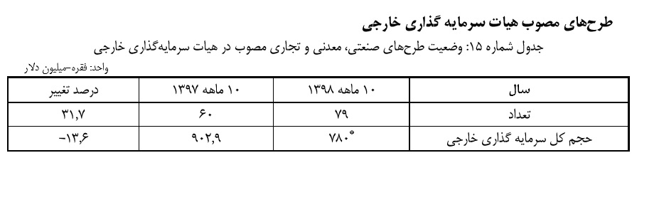 تعداد طرحهای مصوب صنعتی، معدنی و تجاری در هیأت سرمایه گذاری خارجی طی 10 ماهه سال 98 نسبت به مدت مشابه سال 97 معادل 31.7 درصد رشد یافت.