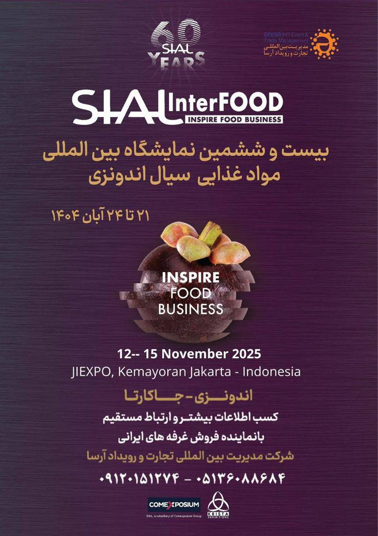 ﺑﻪ ﺍﺳﺘﺤﻀﺎﺭ ﻣﯽ ﺭﺳﺎﻧﺪ، ﺑﺮ ﺍﺳﺎﺱ ﺍﻋﻼﻡ ﺳﺎﺯﻣﺎﻥ ﺗﻮﺳﻌﻪ ﺗﺠﺎﺭﺕ ﺍﯾﺮﺍﻥ، ﻣﺠﻮﺯ ﺑﺮﮔﺰﺍﺭﯼ ﭘﺎﻭﯾﻮﻥ ﺝ.ﺍ. ﺍﯾﺮﺍﻥ ﺩﺭ ﺑﯿﺴﺖ ﻭ ﺷﺸﻤﯿﻦ ﻧﻤﺎﯾﺸﮕﺎﻩ ﻣﻮﺍﺩ ﻏﺬﺍﯾﯽ ﮐﺸﻮﺭ ﺍﻧﺪﻭﻧﺰﯼ ﺑﺎ ﻋﻨﻮﺍﻥ Food Inter Sial ﺍﺯ ﺗﺎﺭﯾﺦ ۲۱ ﻟﻐﺎﯾﺖ ۲۴ ﺁﺑﺎﻥ ﻣﺎﻩ (۱۲ ﺗﺎ ۱۵ ﻧﻮﺍﻣﺒﺮ) ﺳﺎﻝ ﺟﺎﺭﯼ ﺑﻪ ﻧﺎﻡ ﺷﺮﮐﺖ ﻣﺪﯾﺮﯾﺖ ﻭ ﻣﺸﺎﻭﺭﻩ ﺑﯿﻦ ﺍﻟﻤﻠﻠﯽ ﺗﺠﺎﺭﺕ ﻭ ﺭﻭﯾﺪﺍﺩ ﺁﺭﺳﺎ ﺻﺎﺩﺭ ﮔﺮﺩﯾﺪﻩ ﺍﺳﺖ.